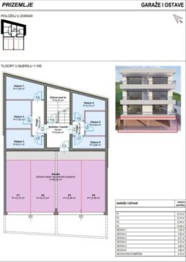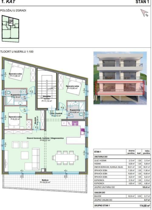 Stan 1-trosoban stan bruto površine 114.60 m2, od čega unutarnji dio neto površina 105.43m2 (ulaz i hodnik 3.13m2, , hodnik 6.09 m2, , dnevni boravak i kuhinja i blag. 55.51m2, spavaća soba 11.90 m2, spavaća soba 10.60 m2, spavaća soba 8.22 m2, kupaonica 5.18m2, kupaonica 4.80m2).