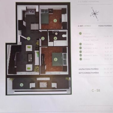 Stan je jugoistočne orijentacije i prostire se na dvije etaže i 95m2. Sastoji se od: